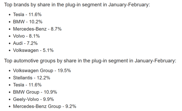 在车企排名方面,在今年前两月中,特斯拉在插电式汽车领域也是最受欢迎的品牌,略微领先于宝马和奔驰。在汽车集团方面,大众集团以19.5%的份额独占鳌头,其次是Stellantis(12.2%)和特斯拉(11.6%)。值得一提的是,吉利-沃尔沃汽车集团以9.9%的市场份额排名第五,略微领先于奔驰的9.2%、