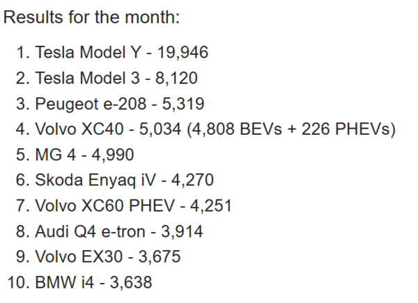 在热门插电式车型方面,特斯拉Model Y以近20000辆的新注册量继续领跑欧洲市场。特斯拉Model 3以超过8000辆的销量位居第二。其他几个车型例如标致e-208、沃尔沃XC40、MG 4的销量也达到了大约5000辆,但值得注意的是,大众ID.3或ID.4并未进入前10名,分别位列第19和第20。