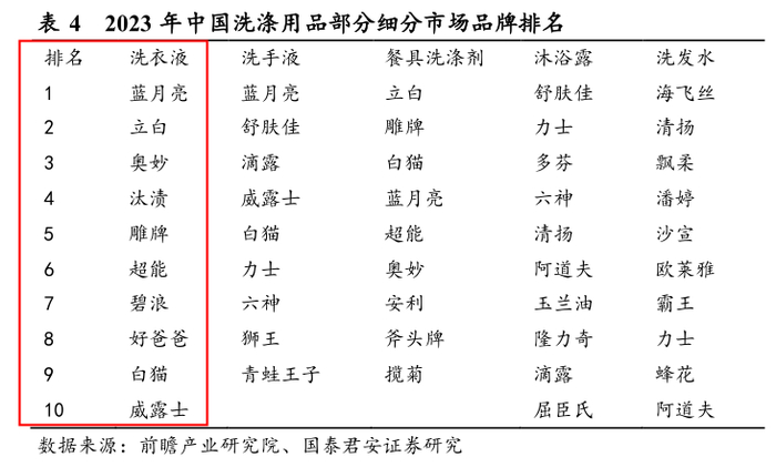 国泰君安还在报告中表示,2023年,国内洗衣液市场份额排名前十的品牌分别为蓝月亮、立白、奥妙、汰渍、雕牌、超能、碧浪、好爸爸、白猫、威露士。
