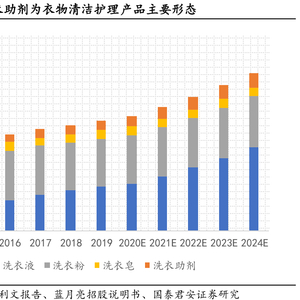 在报告中,国泰君安称,2019年,衣物清洗市场规模为678亿元,2015—2019年的复合年增长率为4.8%。其中,洗衣液和洗衣助剂增长较快。预计2024年,衣物清洗市场规模将达到971亿元,洗衣液市场规模达515亿元。
