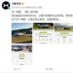 4月20日,小鹏汽车官宣,即日起至2024年5月5日,推出限时5亿元购车补贴,覆盖小鹏G9、G6、P7i、2024款小鹏P5共计四款车型。