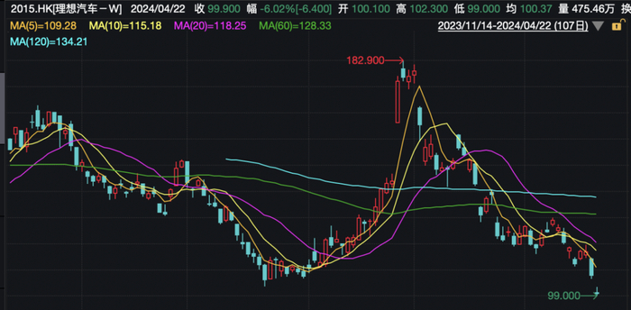 今日,理想汽车港股大幅低开,盘中跌破100港元,截至发稿,跌6.02%,报99.9港元。事实上,自理想MEGA发布遇冷以来,理想汽车股价接连下跌,较2月28日高点已跌去超45%。