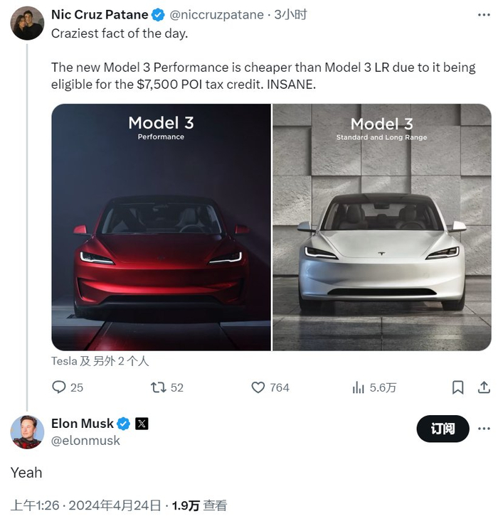 按照原本的定价,Model 3的高性能版($52990)要比长续航版($47740)高出5000多美元,但由于前者能够拿满7500美元的购车税务抵免政策,而后者现在拿不到补贴,所以反倒是高性能版要便宜2000美元。