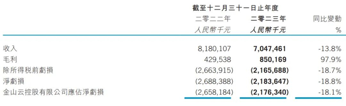 金山云2023年毛利为8.5亿元,较上年同期的4.3亿元增长97.9%;金山云2023年净亏损为21.84亿元,上年同期的净亏损26.88亿元。