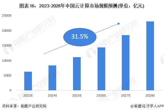云计算在中国市场具有巨大的发展潜力,而云计算业务的发展也印证了这一点。根据中国信通院数据预测,根据中国信通院预测,伴随着经济回暖,全球云计算市场增长率将出现反弹,到2025年市场规模将超过6000亿美元,5年复合增长率将达到23.56%;我国云计算市场将继续保持快速发展态势,预计2025年市场规模将突破1万亿元,5年复合增长率将超过31%。前瞻初步核算,2028年中国云计算的市场规模将接近2.3万亿元。