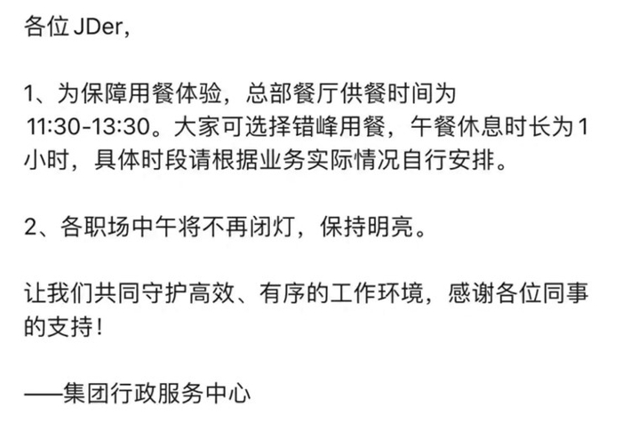 此轮京东内部管理的舆情发酵始于5月21日。当日,有媒体曝出了京东集团行政服务中心正式发布的通知,根据通知内容,京东总部餐厅的供餐时间已明确为每日11:30至13:30,午休时间为1小时。此外,通知还提到,为了营造更加高效、有序的工作环境,各职场将在中午时段保持明亮,不再闭灯。