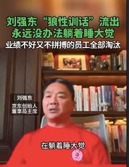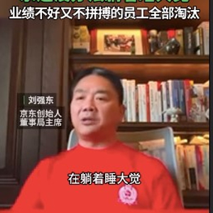 刘强东在视频中指出:“只要业绩好,永远都不用加班加点;业绩只达到平均水平,只要拼搏,公司永远不会辞退你;但是业绩不好,又不拼搏的人,这家公司都不能容忍,都会逐步通过各种手段,全部淘汰出局。”
