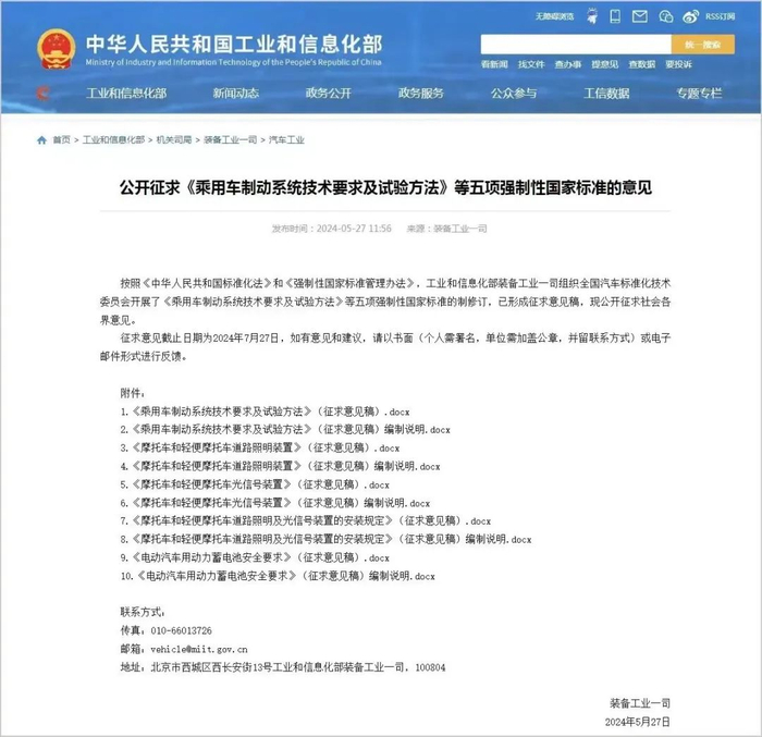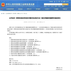 5月27日,工信部官网发文,公开征求《乘用车制动系统技术要求及试验方法》等五项强制性国家标准的意见,其中要求禁止用动能回收功能完全将车刹住。征求意见截止日期为 2024年7月27日。