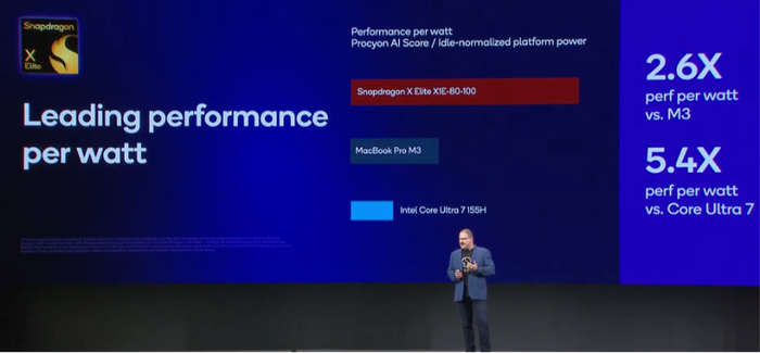骁龙X Elite的NPU能效是苹果M3的2.6倍,是英特尔酷睿Ultra 7 155H的5.4倍。