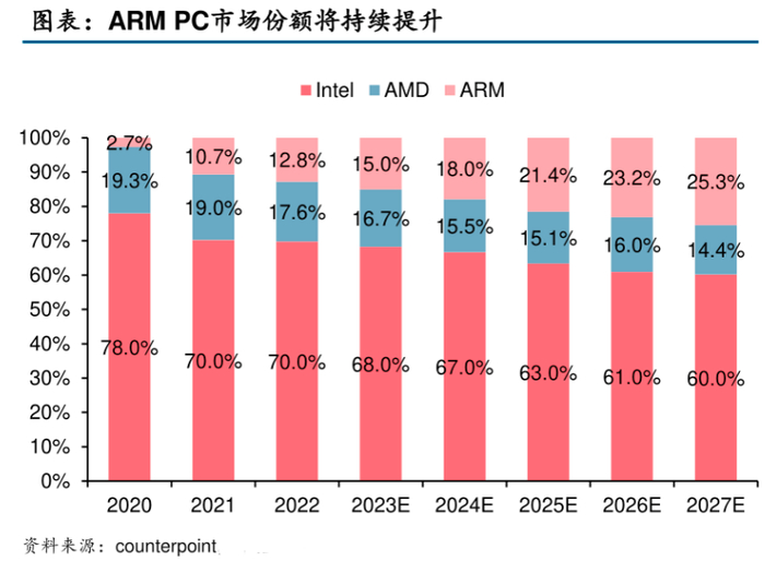 大摩此前预计到2027年,WoA(Windows on ARM) PC芯片销量将达到5000万颗,带来100亿美元的PC CPU收入。