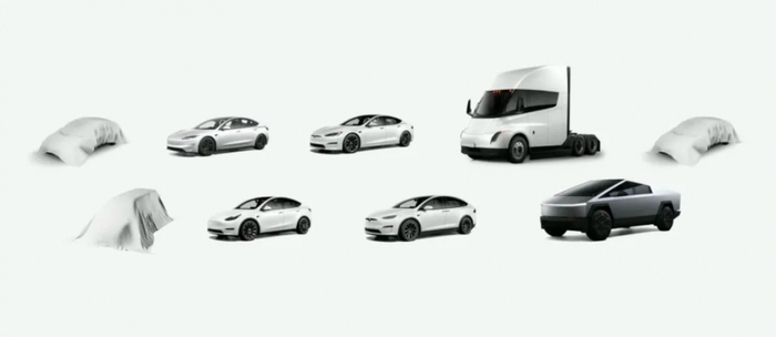 马斯克在会上预告了三款正在研发中的车型。市场猜测展示图中的三款未公布车型可能是特斯拉Robotaxi(自动驾驶出租车)、紧凑型Model Z和一款被调侃为“Cybervan”的形似面包车的车型。