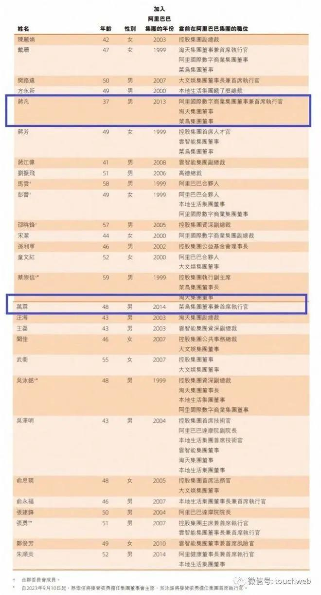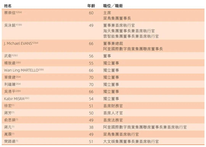 阿里董事局主席、菜鸟集团董事长为蔡崇信,阿里董事兼首席执行官、淘天集团董事长兼首席执行官、云智能集团董事长兼首席执行官为吴泳铭,董事兼总裁、阿里国际数字商业集团联席董事长为J. Michael EVANS;