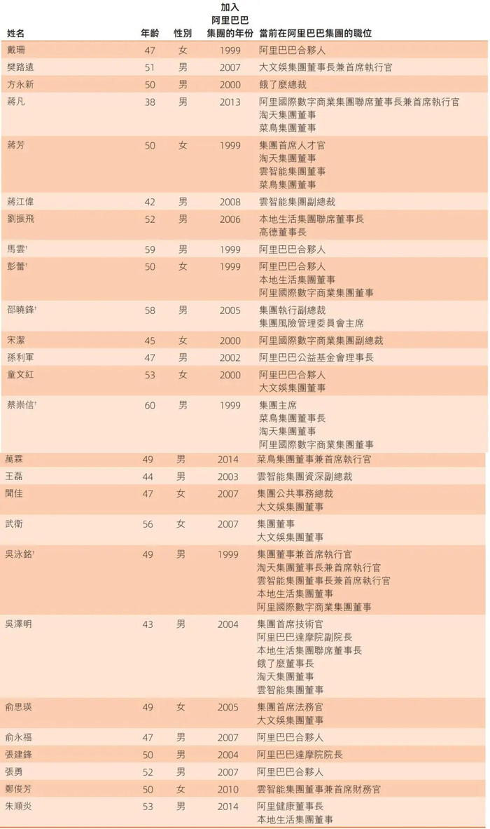2022年年报显示,阿里合伙人共有28名成员,包括马云及高管彭蕾、蔡崇信、张勇、陈丽娟、戴珊、樊路远、方永新、蒋凡、蒋芳、蒋江伟、刘振飞、邵晓锋、宋洁、孙利军、童文红、万霖、汪海、王磊、闻佳、武卫 、吴泳铭、吴泽明、俞思瑛、俞永福、张建锋、郑俊芳、朱顺炎。