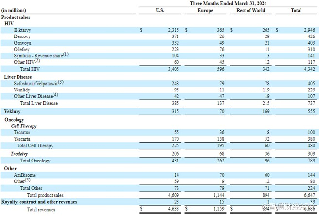除了艾滋领域,2023年肿瘤业务与肝炎业务分别贡献了30亿美元与28亿美元的营收,相比艾滋领域的180亿美元仍有较大差距。2024年第一季度,肿瘤产品销售额小幅同比增长18%,达7.89亿美元,新冠抗病毒药物Veklury(瑞德西韦)则受到市场竞争加剧、药物专利到期等因素影响,销售额5.55亿美元,同比下降3%。