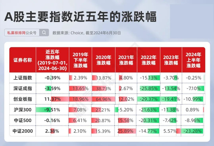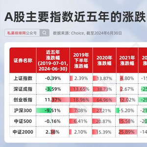 五年的时间,对于私募来说,可以作为长期业绩的考察区间。近五年(2019年7月-2024年6月)来看,A股市场经历了一轮由强转弱、由普涨到普跌的周期:前半程,A股各主要指数基本是普涨状态;2022年以来的后半程基本上呈现普跌状态。近五年累计来看,各主要指数分化明显,表现最好的创业板指涨幅超11%,表现相对落后的沪深300则跌超9%。
