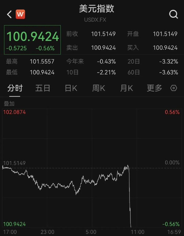 而美元指数则直线下挫。