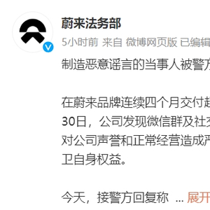 造谣“蔚来破产”当事人已被缉拿
