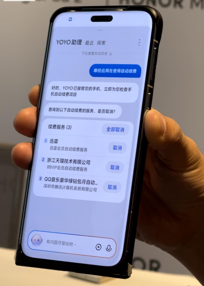 在会后接受媒体专访时,工作人员在尚未发布的荣耀Magic7系列上演示了荣耀智能体YOYO的功能。通过把YOYO唤起,询问“哪些项目在使用自动续费”,手机上会自动检查支付宝和微信的自动续费项目,在显示有三个自动续费项目后,用户这时候可以自己决策是要逐个取消,还是要全部取消。