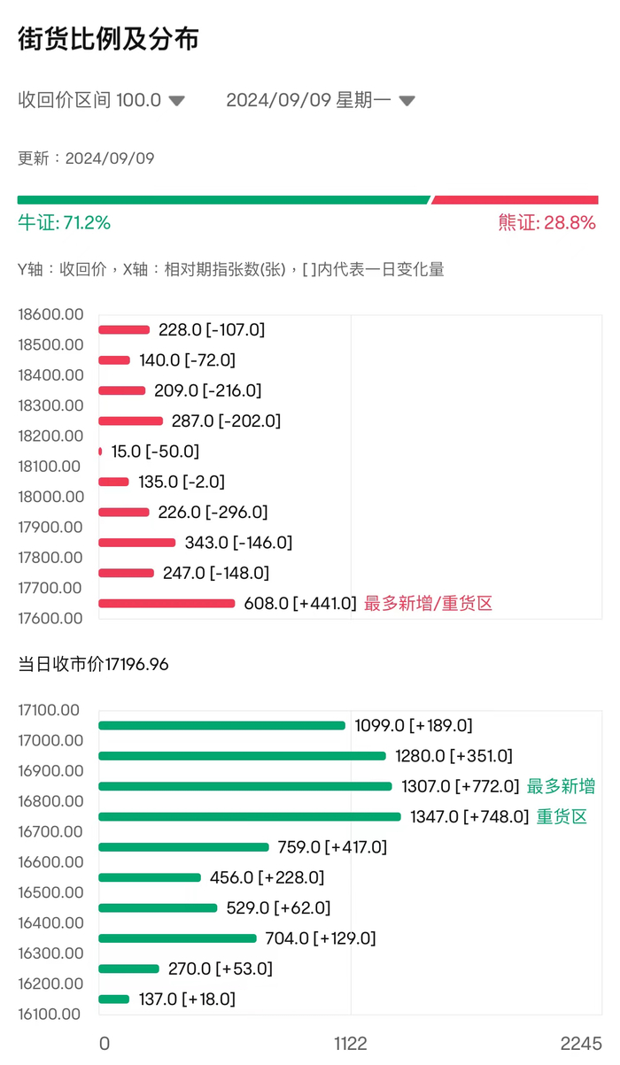 牛证街货重货区在16700-16799区间,该区间最新牛证数量为1347张,较上一交易日增加748张;最多新增在16800-16899区间,该区间最新牛证数量为1307张,较上一交易日增加772张。