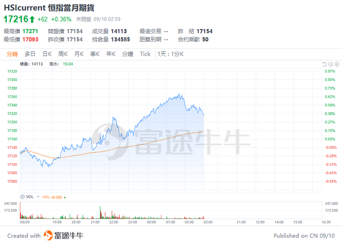 截至9月10日, $恒指当月期货 (HSIcurrent.HK)$ 收报17216点,上涨62点或0.36%,高水19点,未平仓合约总数为122587张。