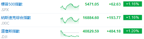 截至收盘,标普500指数涨1.16%,报5471.05点;纳斯达克指数涨1.16%,报16884.6点;道琼斯工业指数涨1.2%,报40829.59点。