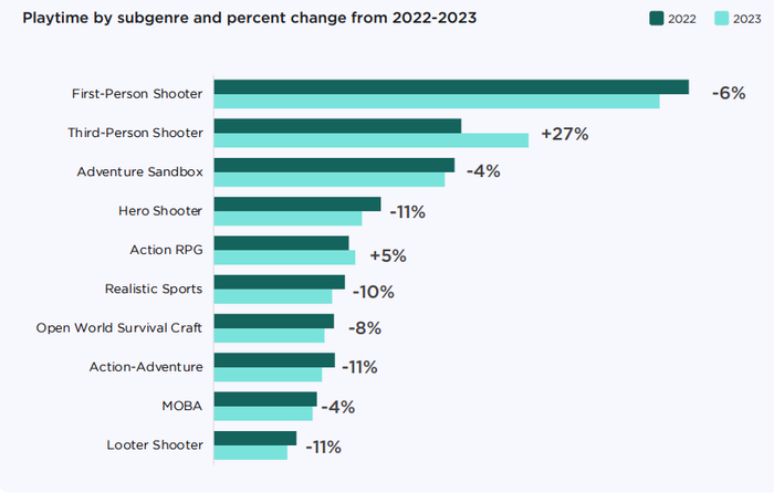 今年4月,Newzoo发布的《2024主机与PC游戏报告》显示,包括FPS、英雄射击在内的全球多项射击子品类的玩家游戏时长均出现了下降,而这些下降的时间大部分流入到了TPS这个子类之中。