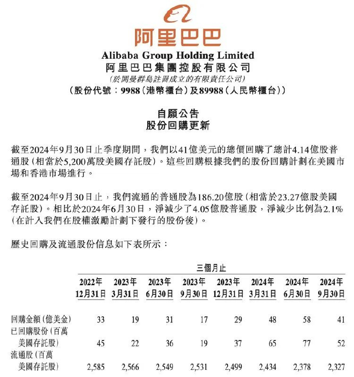 10月2日,阿里巴巴在港交所发布公告,截至2024年9月30日止季度期间,公司以41亿美元的总价回购了总计4.14亿股普通股(相当于5200万股美国存托股)。这些回购根据公司的股份回购计划在美国市场和香港市场进行。
