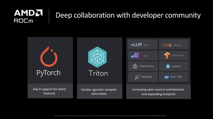 除了硬件,AMD也提了一下自己在软件栈上的进展。近一年来,AMD打通了所有主要AI开发平台。获取了PyTorch的零日更新(可以在软件升级当天使用其新功能)支持及Triton的AMD 硬件兼容。