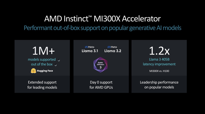 在模型层面,AMD加强了与Huggingface和Meta的合作,对于超过100万种主流模型都能做到开箱即用。Meta的Llama模型还能做到零日支持(可以在模型升级当天使用其新功能)。