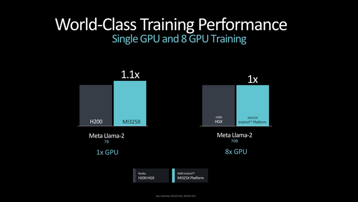 这一提升的结果是,针对Meta Llama-2这种主流模型,MI325X的单GPU训练效率终于超越了H200。而在集群中,其训练效率仍和H200 HGX相当。