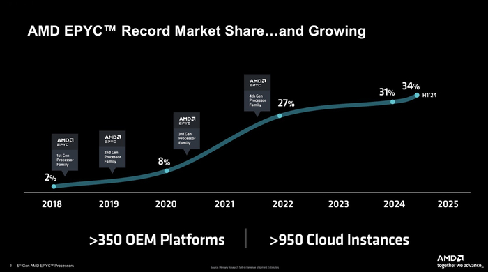 从2018年开始,EPYC服务器从市占率接近0%,经过四代升级达到了2024年H1的34%。生生从英特尔手里夺走了CPU服务器市场的1/3份额。这也是苏姿丰最得意的一场仗。