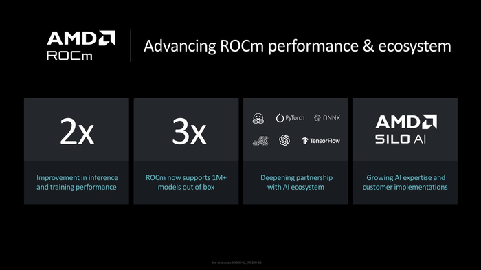 AMD版GPU软件系统ROCm在过去一年内和主流AI开发平台的适配性一直在磨合期,这导致其训练效果有待提升。但这一年来AMD一方面加强升级ROCm,一方面与AI开发平台深度合作,总算是让它有了一倍左右的提升。