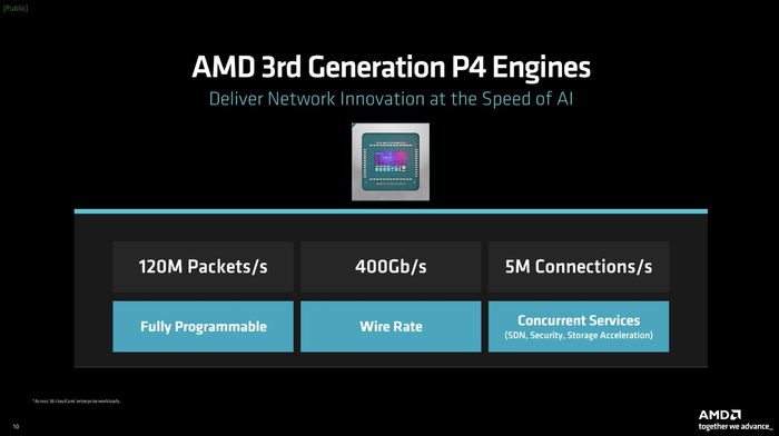 AMD这次推出的第三代可编程 P4引擎就旨在解决这一问题。它的传输速度可以达到400GB/s,与英伟达最新的DPU BlueField-3持平。而且它支持120M每秒的可编程数据包,和5M每秒的并发服务速度。