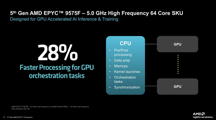 AMD也非常在意Turin作为GPU主机节点带来的GPU算力提升。AMD优化了CPU在AI工作流程中的关键动作,包括数据预处理、内存复制、内核启动和任务协调等。这些优化使得CPU在处理GPU协调任务时更高效,比前代产品快28%。