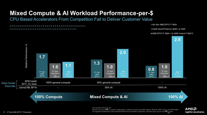 而且AMD还真是认定了这条路的正确性,Turin就很大程度上放弃了单纯一般用途。根据AMD的计算,如果是完全为了一般用途的话,Turin的性价比还不如上一代EPYC,只有到了一半AI用途,一半一般用途的比例下,Turin的性价比优势才能显现出来。