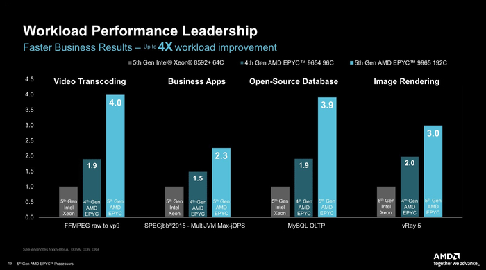 第五代EPYC的表现和侧重,一方面显示了AI战略在AMD当下战略中的重要性。另一方面也是对英特尔近两代Xeon服务器都大力强调AI能力的回应——就算上了AI,AMD的CPU服务器还是遥遥领先。