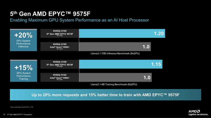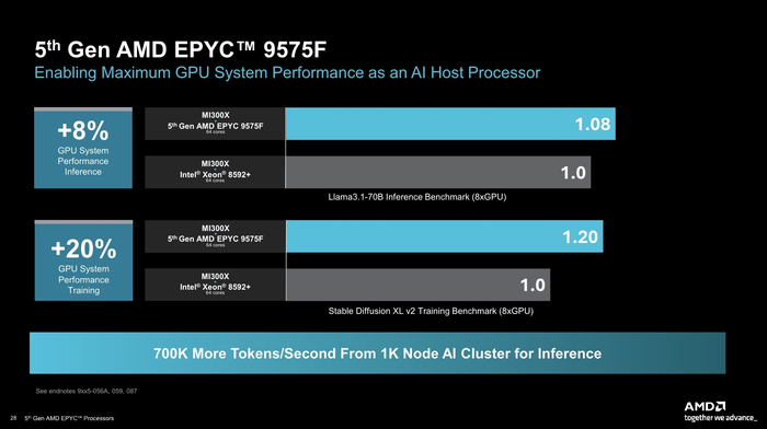 AMD和Xeon 8592做了一下对比,Turin让MI300X的推理性能提升了8%,训练性能提升了20%。