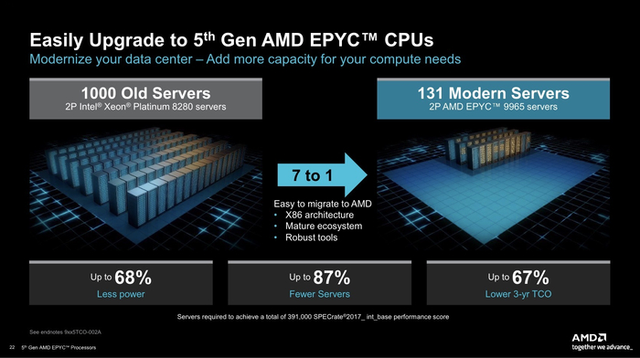 对于这些提升,AMD做了一个形象的展示。如果你用Turin服务器替代上一代Xeon服务器的话,131个Turin就足够达成1000个Xeon服务器的效果。