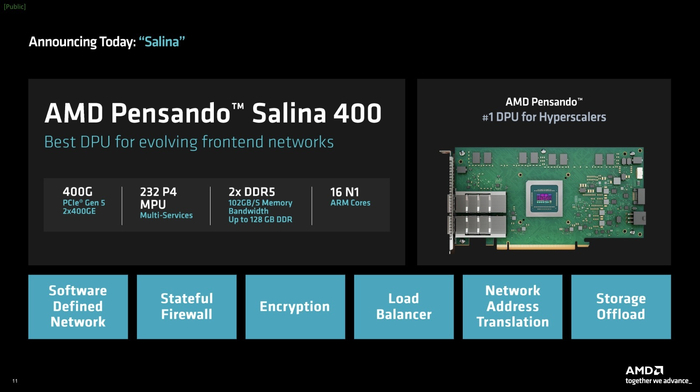 AMD为前端网络提供的解决方案是Pensando Salina 400 DPU,它采用 400G PCIe Gen 5 接口,配备 232 P4 多服务MPU,双通道 DDR5 内存(带宽高达 102GB/s,最大容量 128GB),以及 16 个 N1 ARM 核心。该产品支持软件定义网络、有状态防火墙、加密、负载均衡、网络地址转换和存储卸载等功能。其核心数量与BlueField-3持平,但内存和带宽都有提升(BlueField-3仅有32G DDR5内存)。
