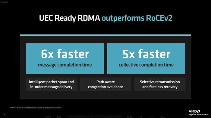 这些提升背后的秘密武器是UEC(超级以太网联盟)协议,据AMD宣称,其相比于Meta训练时使用的传统的RoCE v2协议,服务器中信息传输速度能提高 6 倍,集群间信息传输速度提高了5倍。而且之前的智能分路等多种功能也都是内嵌于UEC协议之中的。