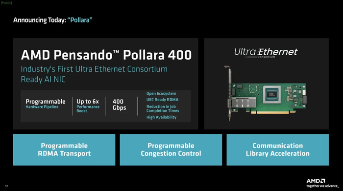 而后端网络的网卡则为Pensando Pollara 400,这是业界首款支持 Ultra Ethernet Consortium 标准的 AI 网络接口卡(NIC)。该产品具有可编程硬件管道,性能提升最高达 6 倍,支持 400Gbps 的网络速度。它采用开放生态系统设计,支持 UEC Ready RDMA 技术,可缩短作业完成时间,并提供高可用性。Pollara 400 的主要特性包括可编程 RDMA 传输、可编程拥塞控制和通信库加速。