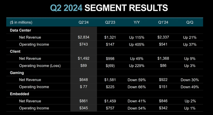 在2024年第二季度的财报中,MI300在单季度内就实现了超过10亿美元的销售额,这一成绩远超市场预期。虽然服务器业务综合销售额仅为英伟达同期的10%。但就目前的形势来看,MI325X很有可能扩大MI300带来的市场占有率。