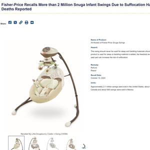 报道显示,此前有5名婴儿在使用婴儿秋千时因窒息而死亡。美国消费者产品安全委员会(CPSC)警告称,秋千不得用于睡眠,也不得添加床上用品。如果该产品用于睡眠或添加床上用品,座垫上的头枕和身体支撑插入物会增加窒息的风险。