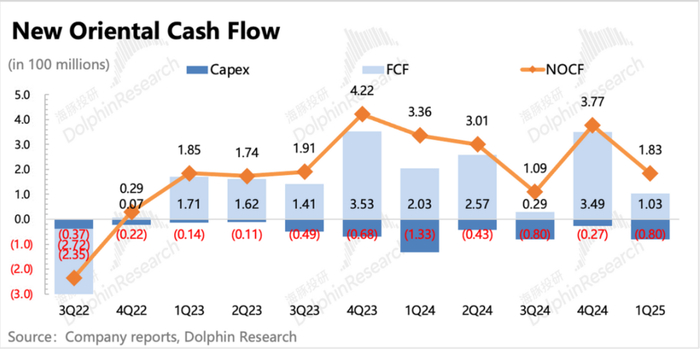 新东方账上现金挺多,预收学费的商业模式也使得它的现金流基本上没有太多担忧。但一季度因为剥离与辉同行,对自由现金流还是产生了不少影响。