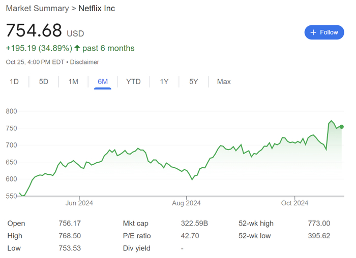 自年初以来,奈飞股价上涨了55%,在美股“七巨头”中仅次于英伟达和Meta。过去一年,奈飞累计涨超84%。