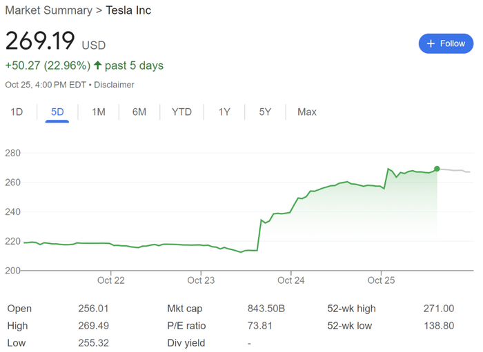 特斯拉第三季度的财报出乎意料的亮眼,结束连续两个季度的利润下跌后创下17%的利润增长,使其创下十多年来最大的单日涨幅纪录。