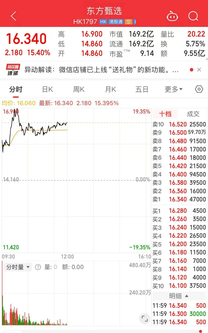 12月20日早盘,港股东方甄选盘中一度涨超19%。12月19日,东方甄选发布消息称,微信店铺已上线“送礼物”新功能。另外,还有多只微信小店概念股跟涨。