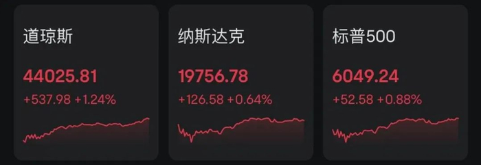 当地时间周二,美股市场出现久违大涨。截至收盘,道指涨1.24%报44025.81点,纳指涨0.64%报19756.78点,标普500指数涨0.88%报6049.24点。