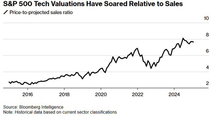 标普500指数科技板块的估值相对于销售额飙升