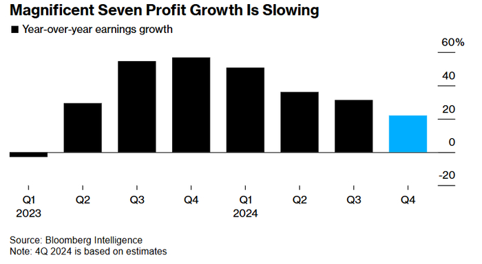 Bloomberg Intelligence汇编的统计数据显示,华尔街分析师们预计第四季度美股七大科技巨头的利润将同比增长22%,为2023年第一季度以来的最小增幅。虽然这仍远高于标普500指数成分股整体利润约8%的预期增幅,但远远低于第一季度51%的增幅,且为连续四个季度出现萎缩。